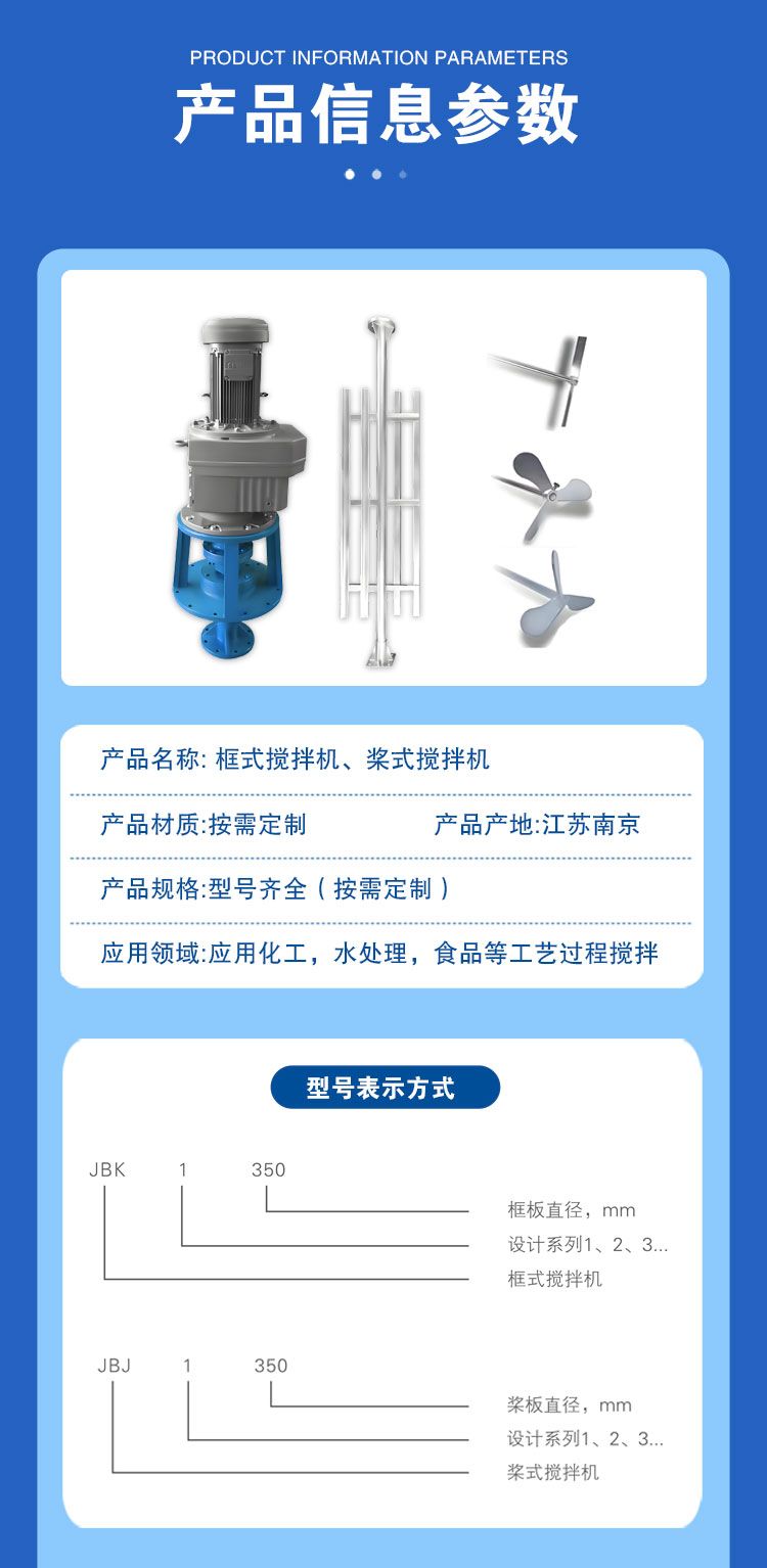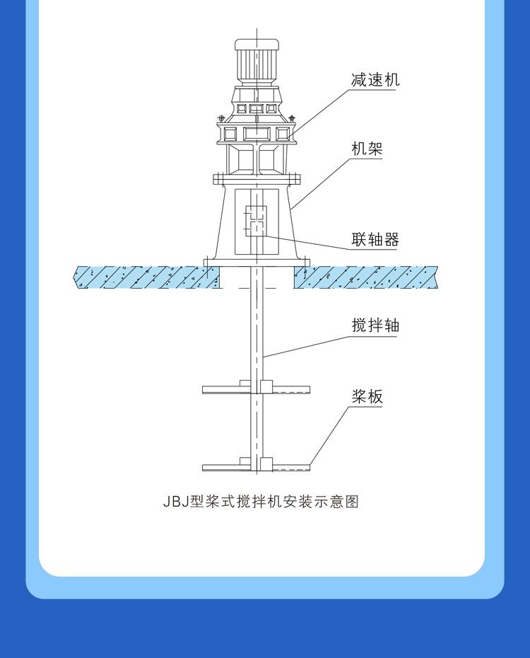 1.JBJ型桨式搅拌机:用于水处理的混凝过程中的混合阶段,当原水与混凝剂或助凝剂液体流经混合池时,在搅拌机的排液作用下产生流动循环,使混凝药剂与水快速充分混合,以达到混凝工艺要求。(混凝:是在污水处理过程中,向污水投加药剂,进行污水与药剂的混合,从而使污水中的胶体物质产生凝聚或絮凝,这一综合过程称为混凝过程。混凝过程通常大约10~30s内完成, 搅拌机通常采用快速混合搅拌,搅拌转速 20-110r/min)